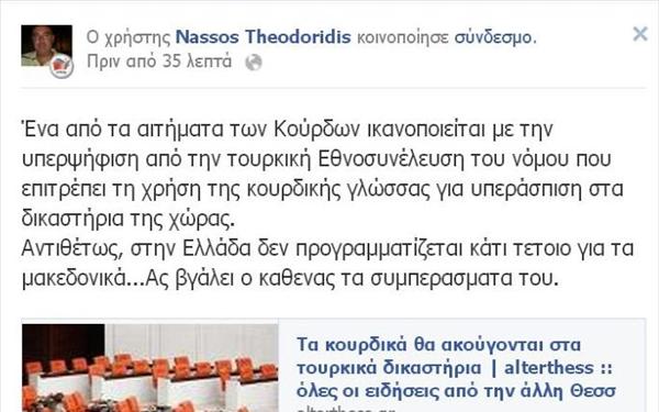 Τον … ασυμμάζευτο έχουν τα στελέχη του ΣΥΡΙΖΑ. Για άλλη μια φορά το στέλεχος του ΣΥΡΙΖΑ Νάσος Θεοδωρίδης προκαλεί με ανάρτηση στο προφίλ του στο facebook καθώς ζητάει να χρησιμοποιείται η δήθεν «μακεδονική γλώσσα» ως γλώσσα υπεράσπισης στα ελληνικά δικαστήρια!