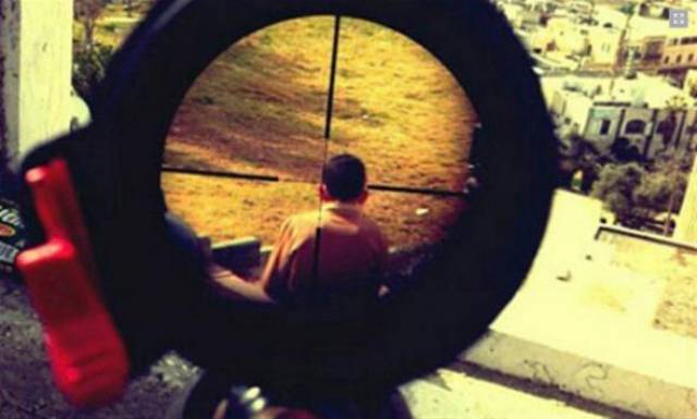 Τούτη τη φορά, πρόκειται για μια φωτογραφία την οποία δημοσίευσε ο Ισραηλινός στρατιώτης Μορ Οστρόβσκι σε μέσο κοινωνικής δικτύωσης, η οποία απεικονίζει το σκοπευτικό πυροβόλου όπλου εβραίου στρατιώτη, να σημαδεύει το κεφάλι ενός ανέμελου Παλαιστινίου πιτσιρικά. Η φωτογραφία κάνει ήδη το γύρο του κόσμου, προκαλώντας αισθήματα οργής σε κάθε εχέφρονα άνθρωπο.