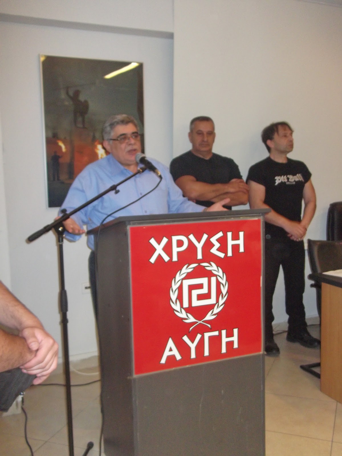Αγωνιστικό χαιρετισμό απεύθυνε ο Αρχηγός της ΧΡΥΣΗΣ ΑΥΓΗΣ, Νικόλαος Μιχαλολιάκος, στους Συναγωνιστές και τις Συναγωνίστριες που είχαν συγκεντρωθεί στα κατάμεστα γραφεία της Τ.Ο. Αθηνών. «Η εκχώρηση εθνικής κυριαρχίας ΔΕΝ ΣΥΓΧΩΡΕΙΤΑΙ» μας τόνισε ο Αρχηγός, για να συμπληρώσει ότι η ανεργία καλπάζει, τα μαγαζιά των Ελλήνων κλείνουν το ένα μετά το άλλο, οι Έλληνες πολίτες στενάζουν κάτω από την μπότα των Δυνάμεων Κατοχής, ενώ η ΠΡΟΔΟΣΙΑ, η ΥΠΟΤΑΓΗ, η ΜΕΙΟΔΟΣΙΑ και η ΕΚΧΩΡΗΣΗ ΕΘΝΙΚΗΣ ΚΥΡΙΑΡΧΙΑΣ έχει γίνει πλέον σημαία για τα ανδράποδα της κυβερνητικής εξουσίας υπό την απειλή της εξόδου από το ευρώ. Μπροστά στη παρουσία της ΧΡΥΣΗΣ ΑΥΓΗΣ όμως, ο πανικός του αμαρτωλού συστήματος είναι κάτι παραπάνω από έκδηλος, αλλά ο λαός έχει μάτια και βλέπει. Βλέπει τον ανελέητο πόλεμο ΟΛΩΝ των πάσης φύσης Ξεπουλημένων Αριβιστών Προδοτών ενάντια σε ένα Κίνημα, που ΔΕΝ λυγίζει, ΔΕΝ υποχωρεί, Δεν συμβιβάζεται, ΔΕΝ υποτάσσεται, ΔΕΝ ξεπουλιέται.