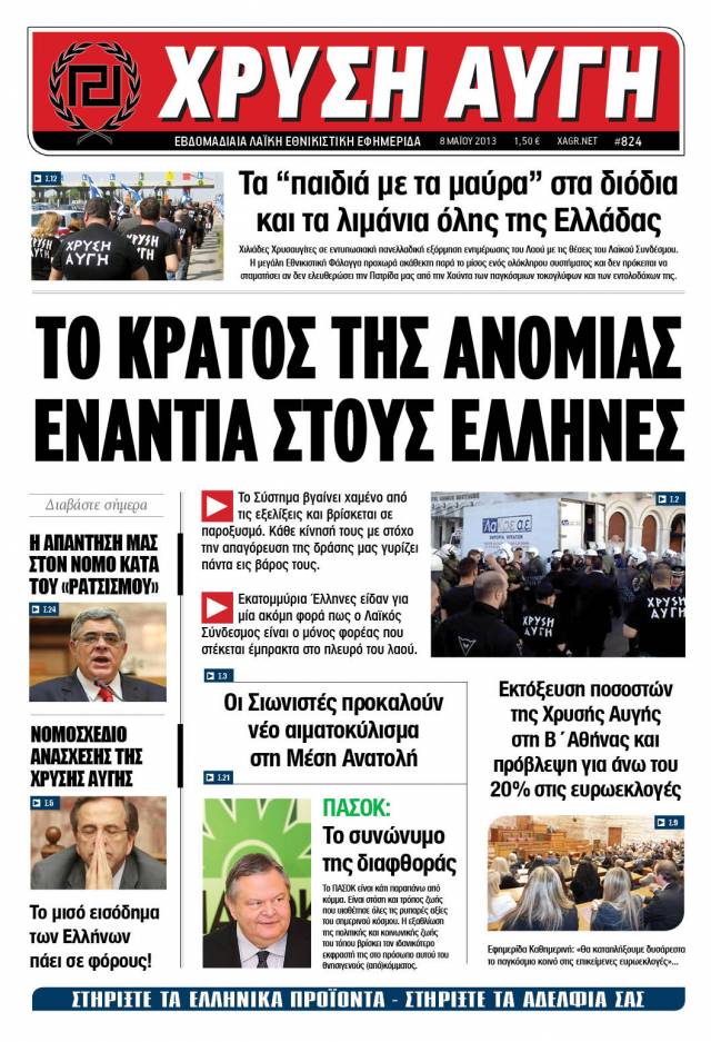 ΚΥΚΛΟΦΟΡΗΣΕ ΣΗΜΕΡΑ, το νέο φύλλο της Λαϊκής Εθνικιστικής Εφημερίδας «ΧΡΥΣΗ ΑΥΓΗ». Ζητήστε την στα περίπτερα και τα πρακτορεία Τύπου όλης της χώρας. Εφημερίδα ΧΡΥΣΗ ΑΥΓΗ: Η Φωνή των Ελλήνων Εθνικιστών ενάντια στην χούντα της παραπληροφόρησης. Στο νέο μας φύλλο διαβάστε: