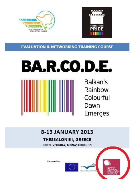 Το υπουργείο Παιδείας και Θρησκευμάτων λοιπόν, μέσω του ιδρύματος νεολαίας και δια βίου μάθησης υπήρξε χρηματοδότης της βαλκανικής μάζωξης κίναιδων και ανώμαλων πάσης φύσεως στη Θεσσαλονίκη, το χρονικό διάστημα από 8 μέχρι 13 Ιανουαρίου 2013. Το αδελφάτο υπό την επωνυμία BA.R.CO.D.E.(Balkan’s Rainbow Colourful Dawn Emerges), με «πολυπληθή» συμμετοχή 36 βαλκάνιων με «ιδιαιτερότητες», σύμφωνα με το δελτίο τύπου, αξιολόγησε τις δράσεις και ενδυνάμωσε τη δικτύωση μεταξύ τους.