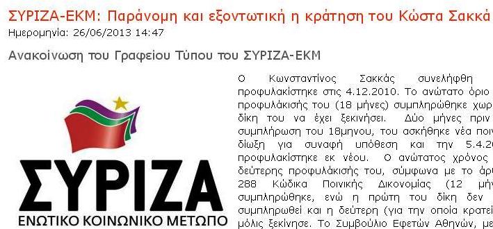 Συγκεκριμένα, απαιτεί την άμεση αποφυλάκιση του Κώστα Σακκά από τις φυλακές Κορυδαλλού ο οποίος είναι προφυλακισμένος για την συμμετοχή του στην τρομοκρατική οργάνωση “Συνωμοσία των Πυρήνων της Φωτιάς” και άλλα συναφή αδικήματα. Ο κατηγορούμενος έκανε αίτηση αποφυλάκισης την οποία απέρριψε το συμβούλιο εφετών, επικυρώνοντας έτσι την απόφαση να παραταθεί η προφυλάκισή του για 36 μήνες. Ο Σύριζα λοιπόν με ανακοίνωσή του χαρακτηρίζει «παράνομη και εξοντωτική την κράτηση» του τρομοκράτη και επισημαίνει ότι πρέπει να αφεθεί ελεύθερος γιατί έχει συμπληρώσει το ανώτατο όριο κράτησης μέχρι να δικαστεί.