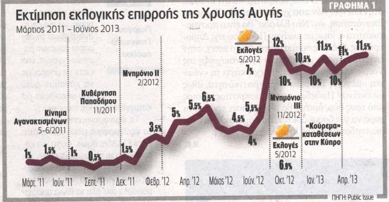 Σε κάποιο άλλο σημείο, υπό τον τίτλο «το μετεκλογικό άλμα» αναφέρονται τα εξής: «Η διπλή εκλογική επιτυχία της Χ.Α. δημιούργησε δυναμική στο εκλογικό σώμα και ώθησε σε νέα ύψη την κοινωνική της απήχηση. Μετεκλογικά, η Χ.Α. ενισχύθηκε στους νέους 18 – 24 ετών (19,5% +6,5%) και αναδείχθηκε 3ο κόμμα. Ταυτόχρονα, διεύρυνε την παρουσία της και στις μεσαίες ηλικιακές ομάδες. Ενισχύθηκε επίσης, στους ανέργους (18%, +6%), όπου είναι 2η δύναμη μετά τον ΣΥΡΙΖΑ, στις νοικοκυρές (13%, +10% -η μεγαλύτερη αύξηση) και στους συνταξιούχους (9%, +6%), όπου εξακολουθεί να υστερεί σημαντικά». Ενώ το κείμενο του Μαυρή ολοκληρώνεται λέγοντας ότι: «Στο α’ εξάμηνο του 2013, τα ¾ (75%) των ψηφοφόρων της Χ.Α., το 2012, παραμένουν σταθεροί στην κομματική τους επιλογή, ενώ το εκλογικό ακροατήριο του κόμματος έχει διευρυνθεί περαιτέρω, εις βάρος τόσο της Ν.Δ. όσο και των ΑΝ. ΕΛΛ.. Λόγω της επιπρόσθετης μετεκλογικής μαζικοποίησης της επιρροής της, οι «παλαιοί» ψηφοφόροι της αντιπροσωπεύουν πλέον μόνον 1 στους 2 (47%) των σημερινών. Εκείνοι που έχουν προστεθεί, προερχόμενοι από τη Ν.Δ., αποτελούν το 15%, οι προερχόμενοι από τους ΑΝ.ΕΛΛ. το 10% και από τον ΣΥΡΙΖΑ το 7%. Η μάχη για τη Δεξιά συνεχίζεται».
