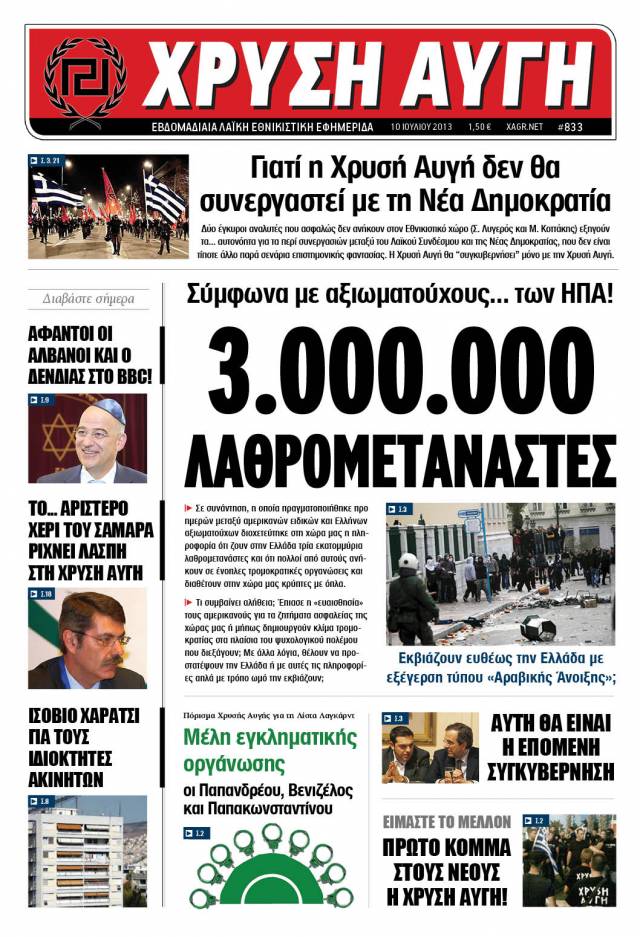 ΚΥΚΛΟΦΟΡΗΣΕ ΣΗΜΕΡΑ, το νέο φύλλο της Λαϊκής Εθνικιστικής Εφημερίδας «ΧΡΥΣΗ ΑΥΓΗ». Ζητήστε την στα περίπτερα και τα πρακτορεία Τύπου όλης της χώρας. Εφημερίδα ΧΡΥΣΗ ΑΥΓΗ: Η Φωνή των Ελλήνων Εθνικιστών ενάντια στην χούντα της παραπληροφόρησης. Στο νέο μας φύλλο διαβάστε: