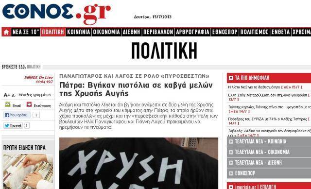 Ακόμη και πιστόλια λέγεται ότι βγήκαν ανάμεσα σε δύο μέλη της Χρυσής Αυγής μέσα στα γραφεία του κόμματος στην Πάτρα, τα οποία ήρθαν στα χέρια προκαλώντας μέχρι και την «πυροσβεστική» κάθοδο στην πόλη των βουλευτών Ηλία Παναγιώταρου και Γιάννη Λαγού προκειμένου να ηρεμήσουν τα πνεύματα.Το πρωτοφανές επεισόδιο συνέβη στα μέσα της προηγούμενης εβδομάδας όταν στη διάρκεια της συνεδρίασης της πενταμελούς νομαρχιακής επιτροπής δύο μέλη της οργάνωσης διαπληκτίστηκαν τόσο έντονα που έφτασαν, σύμφωνα με πληροφορίες του thebest.gr να βγάλουν μέχρι και… πιστόλια. Τότε επενέβησαν οι ψυχραιμότεροι, με αποτέλεσμα το επεισόδιο να λήξει εκεί, αφήνοντας όμως «ανοιχτούς λογαριασμούς». Στελέχη της τοπικής Χρυσής Αυγής, σύμφωνα πάντα με το δημοσίευμα του τοπικού site, αποδίδουν το επεισόδιο σε προσωπική αντιπαράθεση αλλά και εσωκομματικές έριδες.Σύμφωνα με τις ίδιες πληροφορίες, ως αποτέλεσμα της έκρηξης, κλήθηκαν άμεσα οι Παναγιώταρος και Λαγός να σπεύσουν στην Αχαία, προκειμένου να αποφορτίσουν το κλίμα.