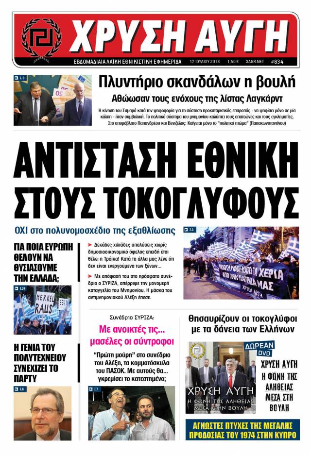 Η ανανεωμένη “Χρυσή Αυγή” (Α.Φ. 834) κυκλοφορεί με δώρο DVD για τον ένα χρόνο της κοινοβουλευτικής παρουσίας των Εθνικιστών στην βουλή. ΚΥΚΛΟΦΟΡΗΣΕ ΣΗΜΕΡΑ, το νέο φύλλο της Λαϊκής Εθνικιστικής Εφημερίδας «ΧΡΥΣΗ ΑΥΓΗ». Ζητήστε την στα περίπτερα και τα πρακτορεία Τύπου όλης της χώρας. Εφημερίδα ΧΡΥΣΗ ΑΥΓΗ: Η Φωνή των Ελλήνων Εθνικιστών ενάντια στην χούντα της παραπληροφόρησης. Στο νέο μας φύλλο διαβάστε: