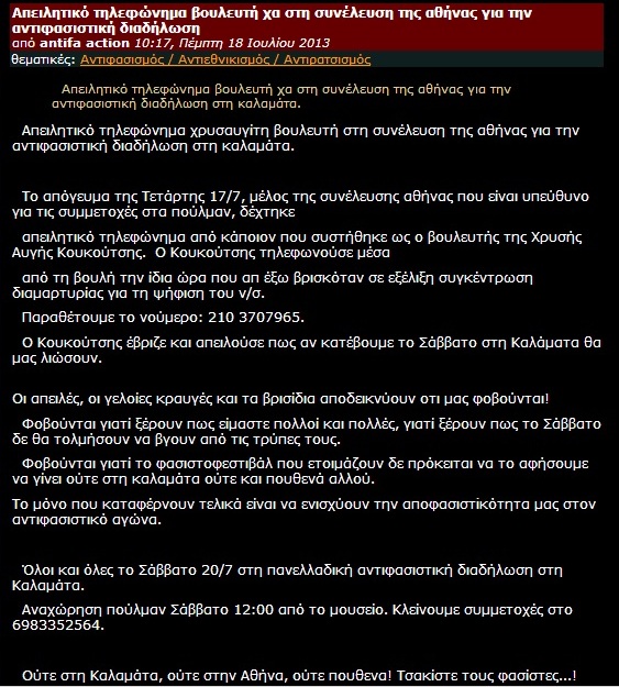 Στην συνέχεια ανέβηκε στο βήμα ο Συναγωνιστής Κουκούτσης Δημήτριος και ξεσκέπασε τον Συριζαίο αποκαλύπτοντας ότι το υποτιθέμενο τηλεφώνημα από τη Χρυσή Αυγή έγινε προς το Indymedia, την ιστοσελίδα η οποία λειτουργεί παρανόμως, στοχοποιώντας και απειλώντας Έλληνες πολίτες, την ιστοσελίδα που υποθάλπει και υμνεί τους αναρχικούς τρομοκράτες, την ιστοσελίδα που ωθεί σε πράξεις βίας και λεηλασίες της περιουσίας Ελλήνων!