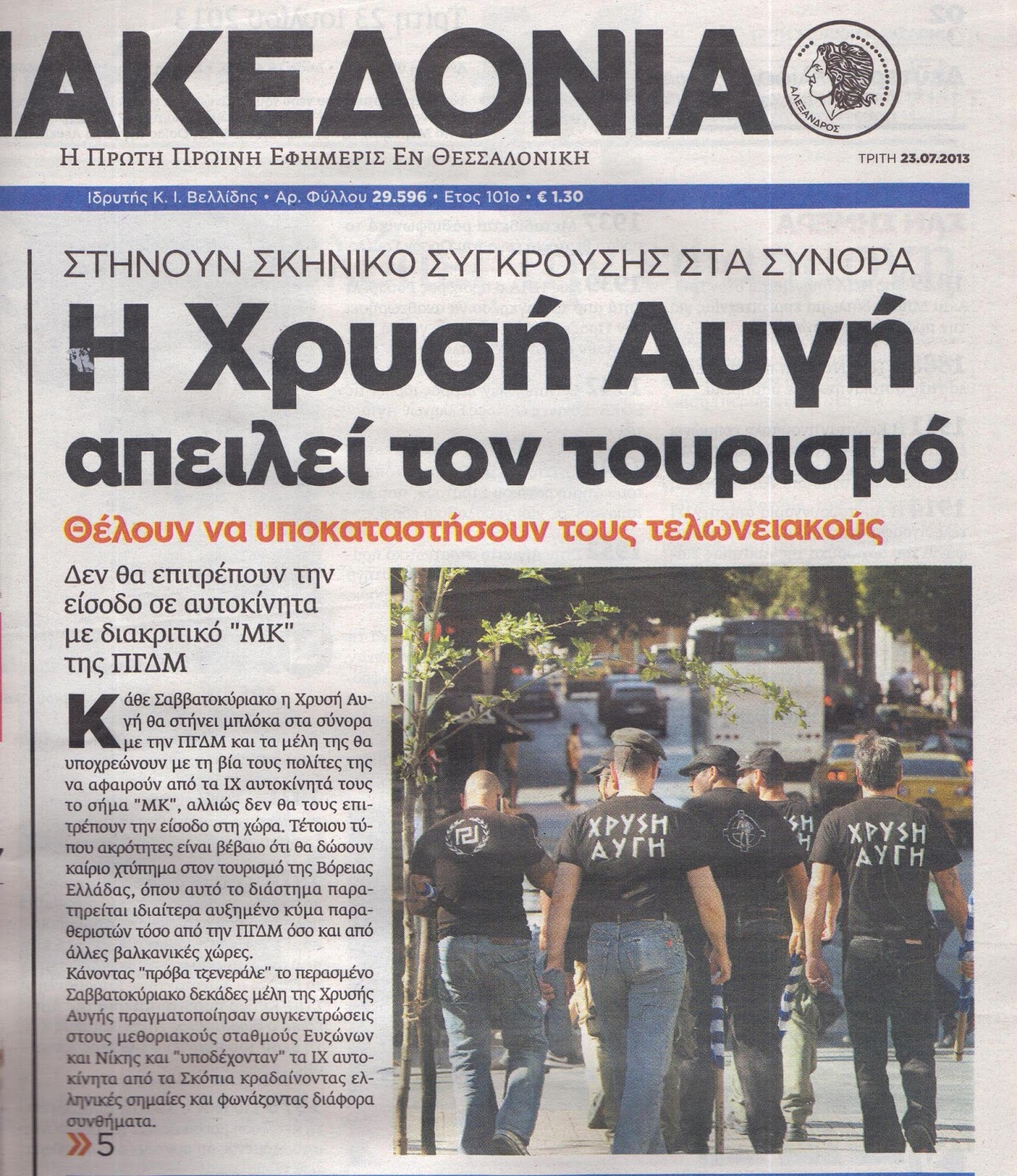 «Δεν θα επιτρέψουν την είσοδο σε αυτοκίνητα με διακριτικό «ΜΚ» της ΠΓΔΜ. Κάθε Σαββατοκύριακο η Χρυσή Αυγή θα στήνει μπλόκα στα σύνορα με την ΠΓΔΜ και τα μέλη της θα υποχρεώνουν με τη βία τους πολίτες της να αφαιρούν από τα ΙΧ αυτοκίνητά τους το σήμα ‘ΜΚ’, αλλιώς δεν θα τους επιτρέπουν την είσοδο στη χώρα. Τέτοιου τύπου ακρότητες είναι βέβαιο ότι θα δώσουν καίριο χτύπημα στον τουρισμό της Βόρειας Ελλάδας, όπου αυτό το διάστημα παρατηρείται ιδιαίτερα αυξημένο κύμα παραθεριστών τόσο από την ΠΓΔΜ όσο και από άλλες βαλκανικές χώρες. Κάνοντας «πρόβα τζενεράλε» το περασμένο Σαββατοκύριακο δεκάδες μέλη της Χρυσής Αυγής πραγματοποίησαν συγκεντρώσεις στους μεθοριακούς σταθμούς Ευζώνων και Νίκης και «υποδέχονταν» τα ΙΧ αυτοκίνητα από τα Σκόπια κραδαίνοντας ελληνικές σημαίες και φωνάζοντας διάφορα συνθήματα.»