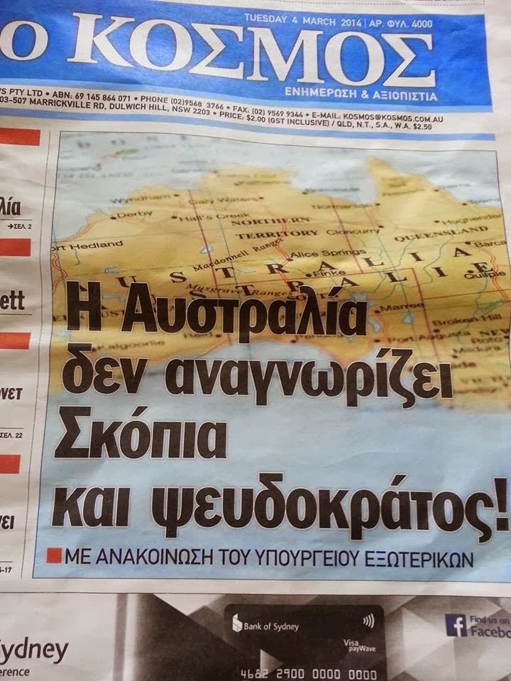 και φαίνεται να έχουν συμβάλει αρκετά στην σταθερή θέση της χώρας σχετικά με την ονομασία των Σκοπίων.To θέμα έγινε και πρωτοσέλιδο σε εφημερίδα των ομογενών μας της Αυστραλίας όπως βλέπετε και στην φώτο