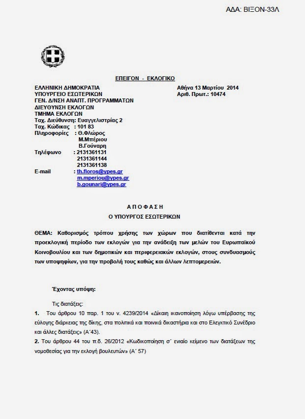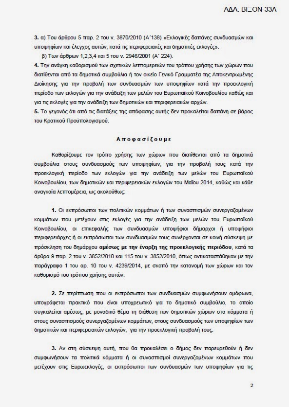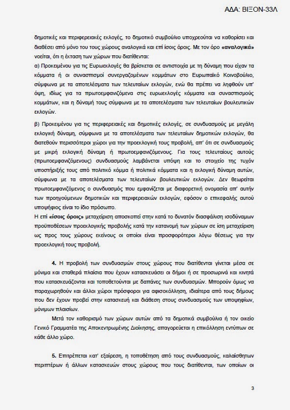 Εδώ η απόφαση του Υπουργείου Εσωτερικών που καθορίζει τους δημόσιους χώρους που δικαιούνται οι εκλογικοί συνδυασμοί, που όμως με το έτσι θέλω δεν εφαρμόζει ο Λάππας και η κλίκα του..