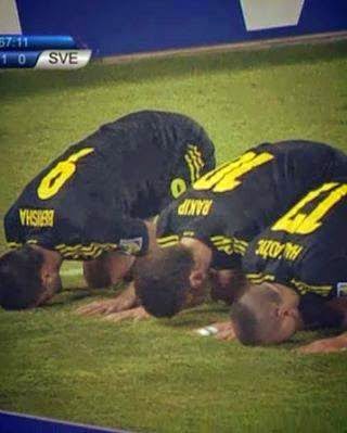 | “Σουηδοί” προσκυνούν τον Αλλάχ μετά από ένα γκόλ της εθνικής ελπίδων της Σουηδίας. Στα αριστερά ο Μπερίσα του ΠΑΟ |