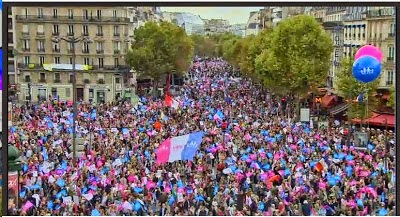 According to police figures the rally attracted 70,000 people, slightly less than the official expected figure released on the eve of the march. As an eyewitness it is difficult to believe these statements: I saw hundreds marching past, at least 20 or 30 abreast, many with small children, in dense formation, for several hours. The whole march covered a full 5 km from end to end (roughly 3.5 miles); many joined along the way and even more returned home upon reaching Montparnasse to allow the upcoming waves of protesters to complete the course. Two or three hundred thousand participants would seem a conservative estimate and probably 500,000 is much nearer to the truth.