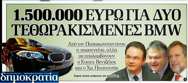 Εδώ φαίνεται να προκύπτει ένα κολοσσιαίο σκάνδαλο που εάν επιβεβαιωθεί, θα οδηγήσει σε ακόμα μία εξεταστική επιτροπή για την σκοτεινή διακυβέρνηση του μνημονίου. Ίσως βεβαίως ο κύριος Βενιζέλος που έκανε χρήση της BMW, θα μπορούσε να διαφωτίσει το πως ακριβώς αγοράστηκε, αφού ο άνθρωπος δεν ήταν μουσαφίρης αλλά υπήρξε υπουργός οικονομικών. Δεν είχε καταλάβει τι γινόταν με τα απόρρητα κονδύλια;