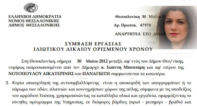 Ως καθαρίστρια του Δήμου Θεσσαλονίκης είχε προσληφθεί επί δύο μήνες, από τον Ιούνιο έως τον Αύγουστο του 2012, όταν και πάλι ήταν δήμαρχος ο Γιάννης Μπουτάρης, η διευθύντρια σήμερα του γραφείου του Τσίπρα στη Θεσσαλονίκη Κατερίνα Νοτοπούλου.