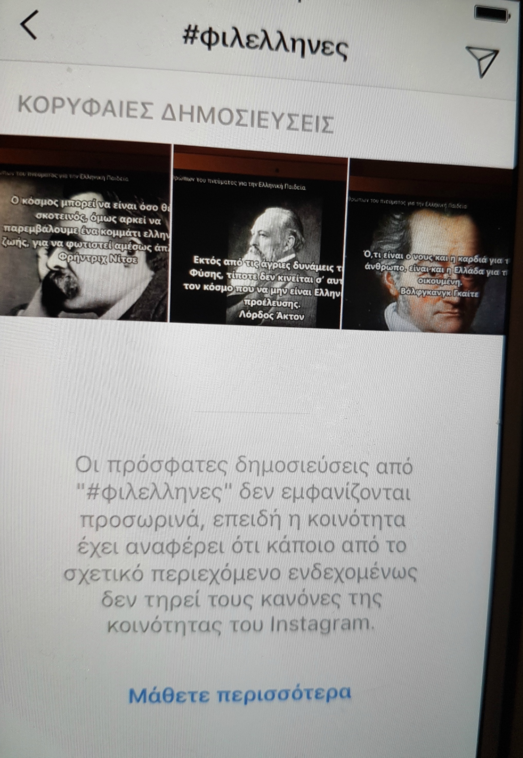 Οι διαχειριστές του Instagram (και σε αυτό το σημείο προκύπτει το εύλογο ερώτημα: μήπως είναι οι ίδιοι που διαχειρίζονται και το facebook?;!) θεώρησαν προσβλητικό περιεχόμενο τα #hashtags #ρήσεις_σοφών και #φιλέλληνες!