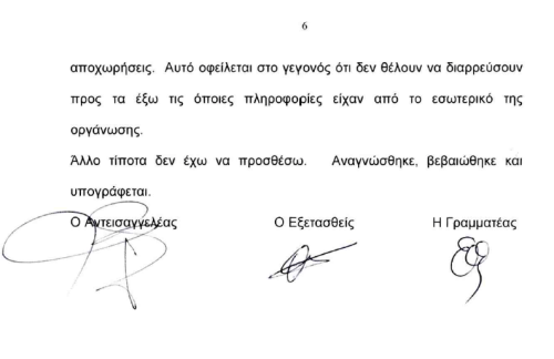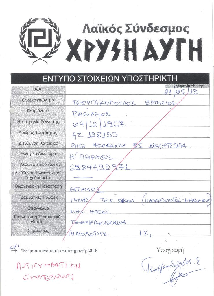 Το περί ου ο λόγος έγγραφο, είναι το «δελτίο στοιχείων υποστηρικτή» που συμπλήρωσε κατά την προσέλευσή του στα γραφεία και φέρει την υπογραφή του. Πρόκειται για την ίδια υπογραφή που υπάρχει και στην κατάθεση που έδωσε στον Βουρλιώτη, όπως προκύπτει από τα επισυναπτόμενα έγγραφα: