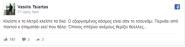 “Κλείστε και το Μετρό κλείστε τα όλα. Ο εξοργισμένος κόσμος είναι σαν το τσουνάμι. Περνάει από παντού κ σταματάει εκεί που θέλει. Όποιος σπέρνει ανέμους θερίζει θύελλες…”.