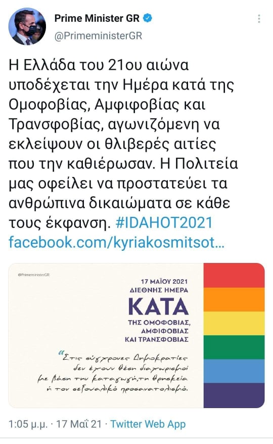 «Η Ελλάδα του 21ου αιώνα αγωνίζεται να εκλείψουν οι θλιβερές αιτίες που την καθιέρωσαν. Με οριζόντια νομοθετικά μέτρα στην εργασία και σε κάθε τομέα της δημόσιας ζωής. Με πρωτοβουλίες όπως η διαμόρφωση Εθνικής Στρατηγικής για την Ισότητα των ΛΟΑΤΚΙ+. Αλλά και με συμπεριφορές που υπερβαίνουν στερεότυπα και προωθούν τη δημιουργική συνύπαρξη. Στις σύγχρονες Δημοκρατίες δεν έχουν θέση διαχωρισμοί με βάση την καταγωγή, τη θρησκεία ή τον σεξουαλικό προσανατολισμό. Ούτε ο 21ος αιώνας ανέχεται τη βία, τις διακρίσεις και τη ρητορική μίσους γύρω από την ταυτότητα, τα χαρακτηριστικά και την έκφραση φύλου. Η Πολιτεία μας οφείλει να προστατεύει τα ανθρώπινα δικαιώματα σε κάθε τους έκφανση. Αξιοποιώντας παντού τον πλούτο της διαφορετικότητας. Και η κοινωνία μας να προοδεύει. Ξεπερνώντας μισαλλόδοξες αγκυλώσεις…».