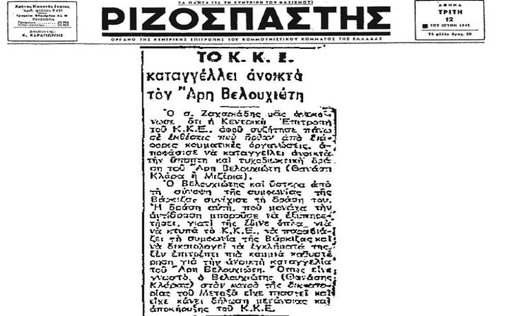 «Το ΠΓ ενέκρινε τη δημοσίευση στο «Ριζοσπάστη», της απόφασης της 1ης Ολομέλειας της ΚΕ για τον Άρη Βελουχιώτη (Θανάση Κλάρα ή Μιζέρια). Ο Κλάρας, αφού μια φορά πρόδωσε και αποκήρυξε το ΚΚΕ γιατί λύγισε μπροστά στην τρομοκρατία του Μανιαδάκη, ξαναζήτησε στον καιρό του εθνικοαπελευθερωτικού αγώνα να ξαναστρώσει με το αίμα του την προδοσία του εκείνη που αναγνώρισε και καταδίκασε. Το ΚΚΕ του ’δωσε τη δυνατότητα αυτή. Σήμερα όμως σε μια δύσκολη και κρίσιμη στιγμή, από δειλία και φόβο, παρά τις υποσχέσεις και τη συμφωνία που στα λόγια έδειξε, απειθαρχεί πάλι, ξαναπροδίδει το ΚΚΕ με την τυχοδιωκτική και ύποπτη δράση του που μονάχα τον εχθρό ευνοεί. Ο Βελουχιώτης ύστερα από τη Συμφωνία της Βάρκιζας συνέχισε τη δράση του. Η δράση αυτή, που μονάχα την αντίδραση μπορούσε να εξυπηρετήσει γιατί της έδινε όπλα για να χτυπά το ΚΚΕ, να παραβιάζει τη Συμφωνία της Βάρκιζας και να δικαιολογεί τα εγκλήματά της, δεν επιτρέπει πια καμμιά καθυστέρηση για την ανοιχτή καταγγελία του Άρη Βελουχιώτη».