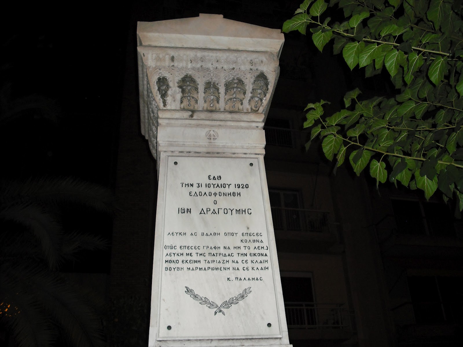 Στις 31 Ιουλίου 1920, την επομένη της απόπειρας δολοφονίας του Ελευθερίου Βενιζέλου στο Παρίσι, ο Ίων Δραγούμης δολοφονήθηκε εν ψυχρώ από βενιζελικά τάγματα ασφαλείας, στη διασταύρωση των οδών Βασιλίσσης Σοφίας και Παπαδιαμαντοπούλου. Η άδικη και άνανδρη δολοφονία του συγκίνησε το πανελλήνιο και ολόκληρο τον πολιτικό κόσμο, συγκλονίζοντας, ταυτόχρονα, την ελληνική καλλιτεχνική ψυχή, με τον Κωστή Παλαμά και τον Άγγελο Σικελιανό να συνθέτους ελεγείες για το δραματικό γεγονός. Στο σημείο της εκτελέσεως του ανεγέρθηκε μνημείο το 1921. Ήταν μια λευκή επιτύμβια στήλη, όπως ακριβώς είχε ζητήσει με τους στίχους του ο Κωστής Παλαμάς, στην «Νεκρική Ωδή» που είχε συνθέσει εις μνήμην του.