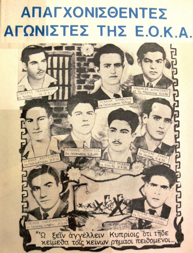 Εν τω μεταξύ, ο αγώνας της ΕΟΚΑ συνεχίζεται κανονικά. Και ο δυνάστης στήνει αγχόνες. Στις 10 Μαΐου απαγχονίζονται στις φυλακές οι Μιχάλης Καραολής και Ανδρέας Δημητρίου, στις 9 Αυγούστου οι Ανδρέας Ζάκος, Ιάκωβος Πατάτσος και Χαρίλαος Μιχαήλ, στις 21 Σεπτεμβρίου οι Μιχαήλ Κουτσόφτας, Στέλιος Μαυρομμάτης και Ανδρέας Παναγίδης. Οι απαγχονισθέντες ήρωες, όλοι κάτω των 25 ετών, κηδεύθηκαν στον περίβολο των φυλακών («Φυλακισμένα Μνήματα»), γιατί οι αποικιοκράτες έτρεμαν στην ιδέα αυτών που θα επακολουθούσαν της δημόσιας κηδείας των.