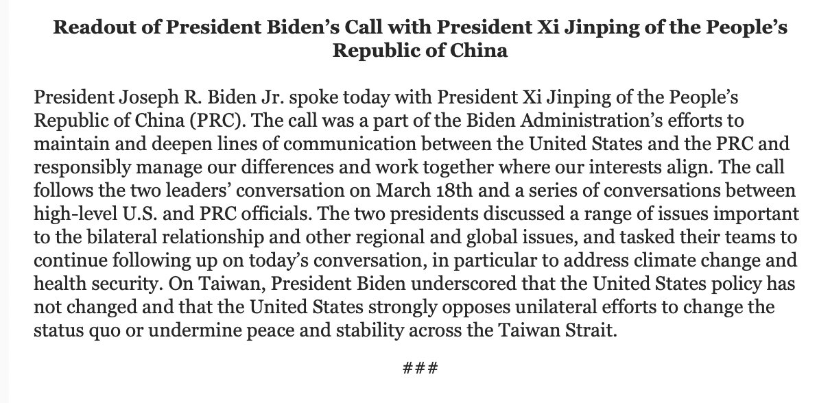 Σύμφωνα με τον Λευκό Οίκο ο Μπάιντεν τόνισε: «Στην Ταϊβάν, ο Πρόεδρος Μπάιντεν υπογράμμισε ότι η πολιτική των Ηνωμένων Πολιτειών δεν έχει αλλάξει και ότι οι Ηνωμένες Πολιτείες αντιτίθενται σθεναρά στις μονομερείς προσπάθειες αλλαγής του status quo ή υπονόμευσης της ειρήνης και της σταθερότητας στα στενά της Ταϊβάν».