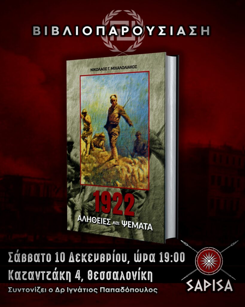 Αυτό το Σάββατο 10 Δεκεμβρίου και ώρα 19:00, θα πραγματοποιηθεί μεελεύθερη είσοδο η, αναβληθείσα λόγω πένθους, βιβλιοπαρουσίαση του νέου ιστορικού έργου “1922 – Αλήθειες και Ψέματα”, στην νέα αίθουσα εκδηλώσεων του Εθνικιστικού πολυχώρου ΣΑΡΙΣΑ. Continue reading