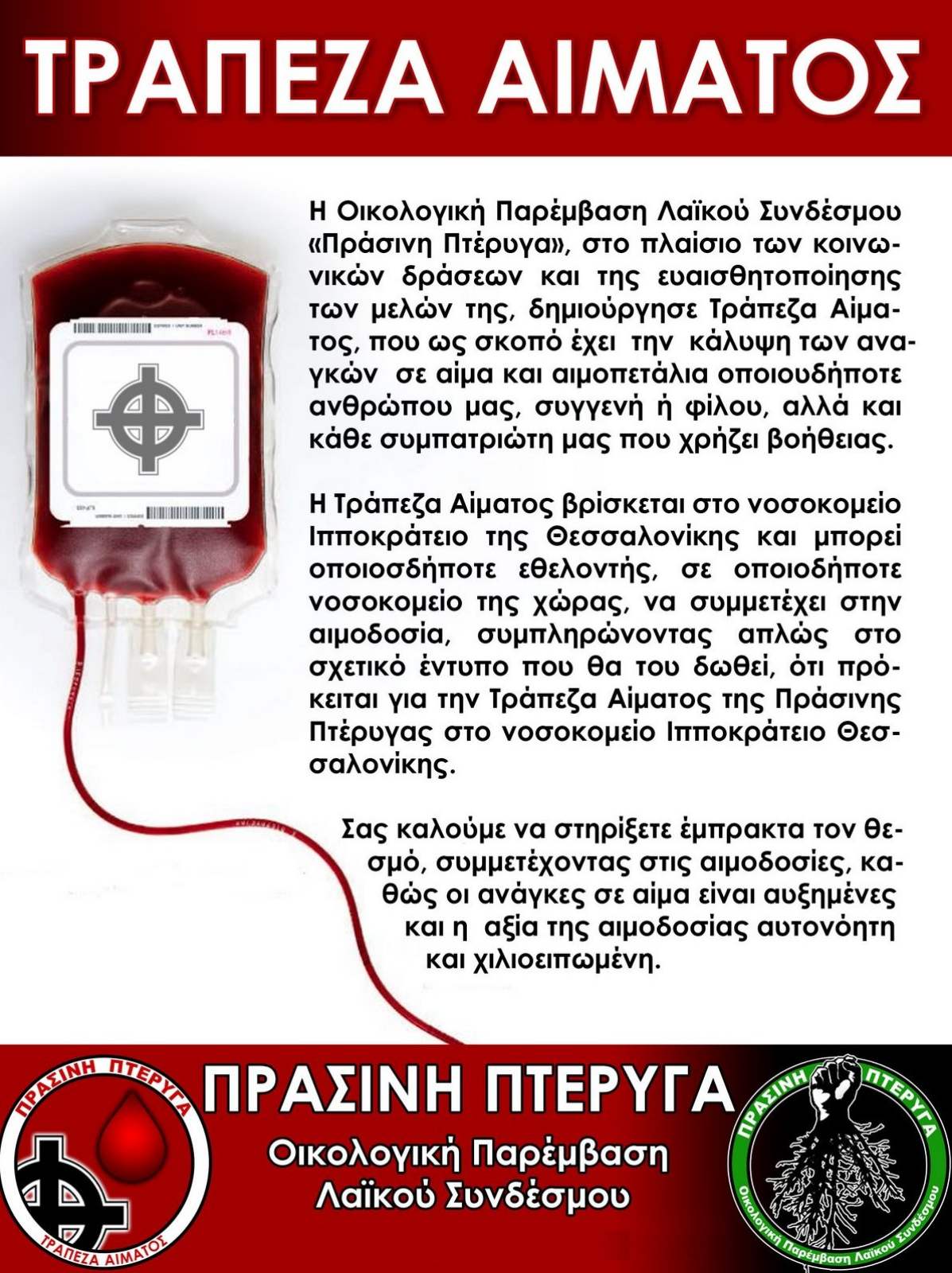 Την Κυριακή 14 Ιουνίου, παγκόσμια ημέρα εθελοντικής αιμοδοσίας, στο Γενικό Νοσοκομείο Κατερίνης, βραβεύτηκαν οι εθελοντές αιμοδότες της Πιερίας είτε ατομικά είτε σε επίπεδο συλλόγων. Ανάμεσα στους βραβευθέντες ήταν και η Πράσινη Πτέρυγα, το τμήμα εθελοντικής αιμοδοσίας της Χρυσής Αυγής Πιερίας. Continue reading