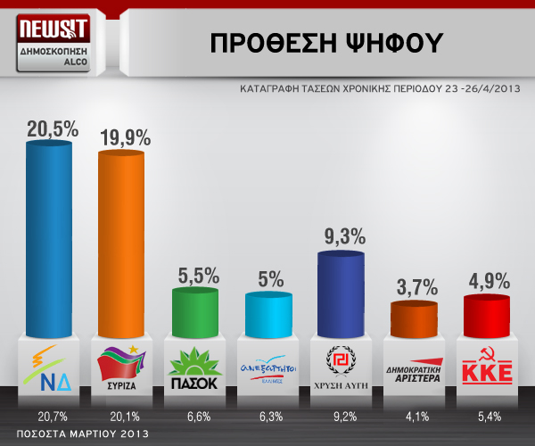 Άλλες δύο δημοσκοπήσεις είδαν το φως της δημοσιότητας, η μεν μία από την εταιρεία Alco για λογαριασμό του «Πρώτου Θέματος» και η δεύτερη από την Κάπα Research για την ναυαγημένη ναυαρχίδα του ΔΟΛ, «Το Βήμα». Continue reading
